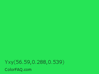 Yxy 56.59,0.288,0.539 Color is a normal green color and the nearest color is Malachite #0bda51. Hex code #26e456 and RGB value is rgb(38,228,86). In RGB color space, this color is composed of 15% red, 89% green, 34% blue, In CMYK color space, this color is composed of 83% cyan, 0% magenta, 62% yellow , 11% black , In HSL color space, this color has a hue angle of 135° , 78% saturation and 52% lightness.
