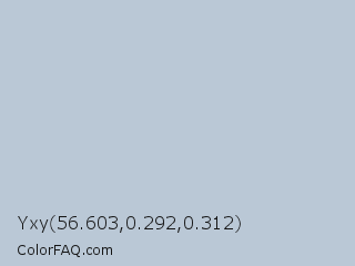 Yxy 56.603,0.292,0.312 Color is a light blue color and the nearest color is Heather #b7c3d0. Hex code #bac8d6 and RGB value is rgb(186,200,214). In RGB color space, this color is composed of 73% red, 78% green, 84% blue, In CMYK color space, this color is composed of 13% cyan, 7% magenta, 0% yellow , 16% black , In HSL color space, this color has a hue angle of 210° , 25% saturation and 78% lightness.