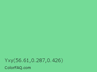 Yxy 56.61,0.287,0.426 Color is a light green color and the nearest color is Medium Aquamarine #66ddaa. Hex code #74db97 and RGB value is rgb(116,219,151). In RGB color space, this color is composed of 45% red, 86% green, 59% blue, In CMYK color space, this color is composed of 47% cyan, 0% magenta, 31% yellow , 14% black , In HSL color space, this color has a hue angle of 140° , 59% saturation and 66% lightness.