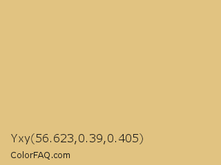 Yxy 56.623,0.39,0.405 Color is a light orange color and the nearest color is Gold Sand #e6be8a. Hex code #e1c381 and RGB value is rgb(225,195,129). In RGB color space, this color is composed of 88% red, 76% green, 51% blue, In CMYK color space, this color is composed of 0% cyan, 13% magenta, 43% yellow , 12% black , In HSL color space, this color has a hue angle of 41° , 62% saturation and 69% lightness.