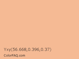 Yxy 56.668,0.396,0.37 Color is a light orange color and the nearest color is Manhattan #f5c999. Hex code #f5ba94 and RGB value is rgb(245,186,148). In RGB color space, this color is composed of 96% red, 73% green, 58% blue, In CMYK color space, this color is composed of 0% cyan, 24% magenta, 40% yellow , 4% black , In HSL color space, this color has a hue angle of 24° , 83% saturation and 77% lightness.