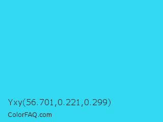 Yxy 56.701,0.221,0.299 Color is a normal cyan color and the nearest color is Turquoise #40e0d0. Hex code #33d9f0 and RGB value is rgb(51,217,240). In RGB color space, this color is composed of 20% red, 85% green, 94% blue, In CMYK color space, this color is composed of 79% cyan, 10% magenta, 0% yellow , 6% black , In HSL color space, this color has a hue angle of 187° , 86% saturation and 57% lightness.
