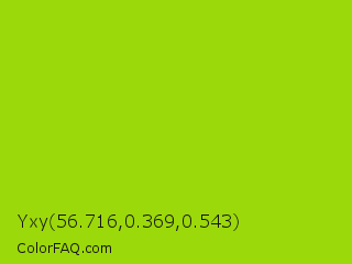 Yxy 56.716,0.369,0.543 Color is a normal lime color and the nearest color is Vivid Lime Green #a6d608. Hex code #9cd90a and RGB value is rgb(156,217,10). In RGB color space, this color is composed of 61% red, 85% green, 4% blue, In CMYK color space, this color is composed of 28% cyan, 0% magenta, 95% yellow , 15% black , In HSL color space, this color has a hue angle of 78° , 91% saturation and 45% lightness.