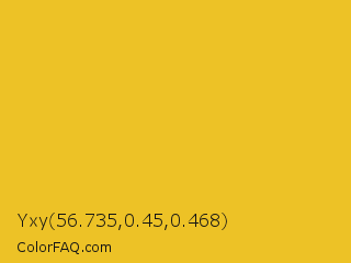 Yxy 56.735,0.45,0.468 Color is a normal yellow color and the nearest color is Saffron #f4c430. Hex code #edc226 and RGB value is rgb(237,194,38). In RGB color space, this color is composed of 93% red, 76% green, 15% blue, In CMYK color space, this color is composed of 0% cyan, 18% magenta, 84% yellow , 7% black , In HSL color space, this color has a hue angle of 47° , 85% saturation and 54% lightness.