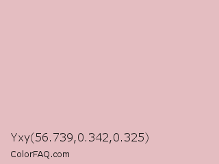 Yxy 56.739,0.342,0.325 Color is a very light red color and the nearest color is Cavern Pink #e3bebe. Hex code #e4bdc1 and RGB value is rgb(228,189,193). In RGB color space, this color is composed of 89% red, 74% green, 76% blue, In CMYK color space, this color is composed of 0% cyan, 17% magenta, 15% yellow , 11% black , In HSL color space, this color has a hue angle of 354° , 42% saturation and 82% lightness.