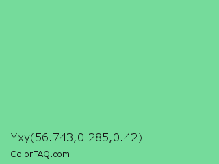 Yxy 56.743,0.285,0.42 Color is a light green color and the nearest color is Medium Aquamarine #66ddaa. Hex code #75db9b and RGB value is rgb(117,219,155). In RGB color space, this color is composed of 46% red, 86% green, 61% blue, In CMYK color space, this color is composed of 47% cyan, 0% magenta, 29% yellow , 14% black , In HSL color space, this color has a hue angle of 142° , 59% saturation and 66% lightness.