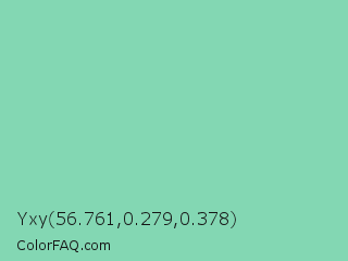 Yxy 56.761,0.279,0.378 Color is a light green color and the nearest color is Vista Blue #8fd6b4. Hex code #83d7b3 and RGB value is rgb(131,215,179). In RGB color space, this color is composed of 51% red, 84% green, 70% blue, In CMYK color space, this color is composed of 39% cyan, 0% magenta, 17% yellow , 16% black , In HSL color space, this color has a hue angle of 154° , 51% saturation and 68% lightness.
