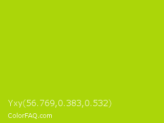 Yxy 56.769,0.383,0.532 Color is a normal lime color and the nearest color is Vivid Lime Green #a6d608. Hex code #abd609 and RGB value is rgb(171,214,9). In RGB color space, this color is composed of 67% red, 84% green, 4% blue, In CMYK color space, this color is composed of 20% cyan, 0% magenta, 96% yellow , 16% black , In HSL color space, this color has a hue angle of 73° , 92% saturation and 44% lightness.