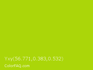 Yxy 56.771,0.383,0.532 Color is a normal lime color and the nearest color is Vivid Lime Green #a6d608. Hex code #abd609 and RGB value is rgb(171,214,9). In RGB color space, this color is composed of 67% red, 84% green, 4% blue, In CMYK color space, this color is composed of 20% cyan, 0% magenta, 96% yellow , 16% black , In HSL color space, this color has a hue angle of 73° , 92% saturation and 44% lightness.