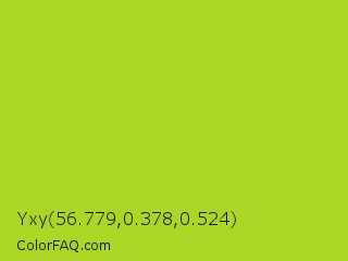 Yxy 56.779,0.378,0.524 Color is a normal lime color and the nearest color is Yellow Green #9acd32. Hex code #aad626 and RGB value is rgb(170,214,38). In RGB color space, this color is composed of 67% red, 84% green, 15% blue, In CMYK color space, this color is composed of 21% cyan, 0% magenta, 82% yellow , 16% black , In HSL color space, this color has a hue angle of 75° , 70% saturation and 49% lightness.
