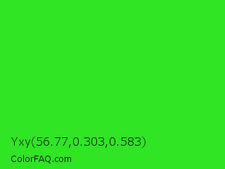 Yxy 56.77,0.303,0.583 Color is a normal green color and the nearest color is Lime Green #32cd32. Hex code #2fe524 and RGB value is rgb(47,229,36). In RGB color space, this color is composed of 18% red, 90% green, 14% blue, In CMYK color space, this color is composed of 79% cyan, 0% magenta, 84% yellow , 10% black , In HSL color space, this color has a hue angle of 117° , 79% saturation and 52% lightness.