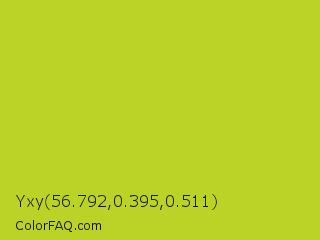 Yxy 56.792,0.395,0.511 Color is a normal yellow color and the nearest color is Key Lime Pie #bfc921. Hex code #bbd226 and RGB value is rgb(187,210,38). In RGB color space, this color is composed of 73% red, 82% green, 15% blue, In CMYK color space, this color is composed of 11% cyan, 0% magenta, 82% yellow , 18% black , In HSL color space, this color has a hue angle of 68° , 69% saturation and 49% lightness.