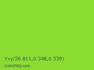 Yxy 56.811,0.348,0.539 Color is a normal green color and the nearest color is Kiwi #8ee53f. Hex code #8adc31 and RGB value is rgb(138,220,49). In RGB color space, this color is composed of 54% red, 86% green, 19% blue, In CMYK color space, this color is composed of 37% cyan, 0% magenta, 78% yellow , 14% black , In HSL color space, this color has a hue angle of 89° , 71% saturation and 53% lightness.