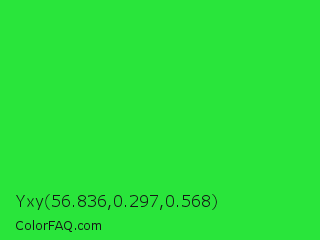 Yxy 56.836,0.297,0.568 Color is a normal green color and the nearest color is Lime Green #32cd32. Hex code #29e53b and RGB value is rgb(41,229,59). In RGB color space, this color is composed of 16% red, 90% green, 23% blue, In CMYK color space, this color is composed of 82% cyan, 0% magenta, 74% yellow , 10% black , In HSL color space, this color has a hue angle of 126° , 78% saturation and 53% lightness.