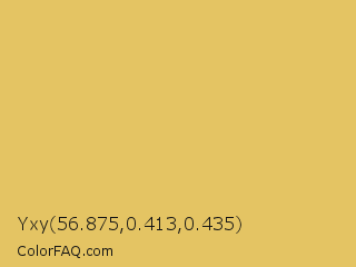 Yxy 56.875,0.413,0.435 Color is a light orange color and the nearest color is Equator #e1bc64. Hex code #e4c463 and RGB value is rgb(228,196,99). In RGB color space, this color is composed of 89% red, 77% green, 39% blue, In CMYK color space, this color is composed of 0% cyan, 14% magenta, 57% yellow , 11% black , In HSL color space, this color has a hue angle of 45° , 70% saturation and 64% lightness.