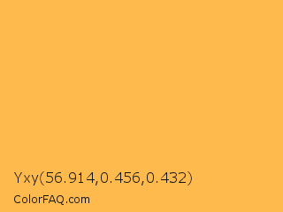 Yxy 56.914,0.456,0.432 Color is a light orange color and the nearest color is Pastel Orange #ffb347. Hex code #ffba4d and RGB value is rgb(255,186,77). In RGB color space, this color is composed of 100% red, 73% green, 30% blue, In CMYK color space, this color is composed of 0% cyan, 27% magenta, 70% yellow , 0% black , In HSL color space, this color has a hue angle of 37° , 100% saturation and 65% lightness.