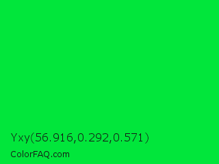 Yxy 56.916,0.292,0.571 Color is a normal green color and the nearest color is Malachite #0bda51. Hex code #01e63b and RGB value is rgb(1,230,59). In RGB color space, this color is composed of 0% red, 90% green, 23% blue, In CMYK color space, this color is composed of 100% cyan, 0% magenta, 74% yellow , 10% black , In HSL color space, this color has a hue angle of 135° , 99% saturation and 45% lightness.