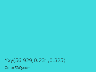 Yxy 56.929,0.231,0.325 Color is a normal cyan color and the nearest color is Turquoise #40e0d0. Hex code #3edbde and RGB value is rgb(62,219,222). In RGB color space, this color is composed of 24% red, 86% green, 87% blue, In CMYK color space, this color is composed of 72% cyan, 1% magenta, 0% yellow , 13% black , In HSL color space, this color has a hue angle of 181° , 71% saturation and 56% lightness.