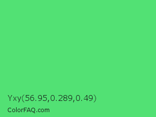 Yxy 56.95,0.289,0.49 Color is a normal green color and the nearest color is Emerald #50c878. Hex code #52e174 and RGB value is rgb(82,225,116). In RGB color space, this color is composed of 32% red, 88% green, 45% blue, In CMYK color space, this color is composed of 64% cyan, 0% magenta, 48% yellow , 12% black , In HSL color space, this color has a hue angle of 134° , 70% saturation and 60% lightness.