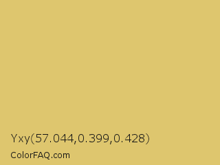 Yxy 57.044,0.399,0.428 Color is a light yellow color and the nearest color is Chenin #dfcd6f. Hex code #dec66e and RGB value is rgb(222,198,110). In RGB color space, this color is composed of 87% red, 78% green, 43% blue, In CMYK color space, this color is composed of 0% cyan, 11% magenta, 50% yellow , 13% black , In HSL color space, this color has a hue angle of 47° , 63% saturation and 65% lightness.
