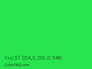 Yxy 57.054,0.291,0.548 Color is a normal green color and the nearest color is Malachite #0bda51. Hex code #28e54f and RGB value is rgb(40,229,79). In RGB color space, this color is composed of 16% red, 90% green, 31% blue, In CMYK color space, this color is composed of 83% cyan, 0% magenta, 66% yellow , 10% black , In HSL color space, this color has a hue angle of 132° , 78% saturation and 53% lightness.