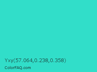 Yxy 57.064,0.238,0.358 Color is a normal cyan color and the nearest color is Turquoise PWG #30d5c8. Hex code #31dec9 and RGB value is rgb(49,222,201). In RGB color space, this color is composed of 19% red, 87% green, 79% blue, In CMYK color space, this color is composed of 78% cyan, 0% magenta, 9% yellow , 13% black , In HSL color space, this color has a hue angle of 173° , 72% saturation and 53% lightness.