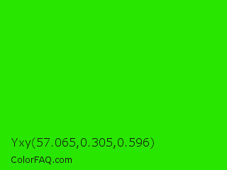 Yxy 57.065,0.305,0.596 Color is a normal green color and the nearest color is Harlequin #3fff00. Hex code #29e600 and RGB value is rgb(41,230,0). In RGB color space, this color is composed of 16% red, 90% green, 0% blue, In CMYK color space, this color is composed of 82% cyan, 0% magenta, 100% yellow , 10% black , In HSL color space, this color has a hue angle of 109° , 100% saturation and 45% lightness.
