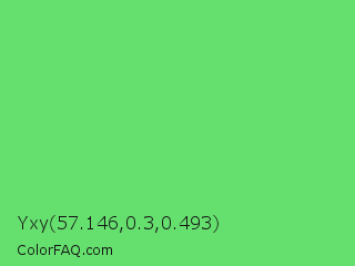 Yxy 57.146,0.3,0.493 Color is a light green color and the nearest color is Pastel Green #77dd77. Hex code #65e06e and RGB value is rgb(101,224,110). In RGB color space, this color is composed of 40% red, 88% green, 43% blue, In CMYK color space, this color is composed of 55% cyan, 0% magenta, 51% yellow , 12% black , In HSL color space, this color has a hue angle of 124° , 66% saturation and 64% lightness.
