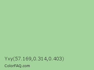 Yxy 57.169,0.314,0.403 Color is a light green color and the nearest color is Granny Smith Apple Crayola #9de093. Hex code #a3d49c and RGB value is rgb(163,212,156). In RGB color space, this color is composed of 64% red, 83% green, 61% blue, In CMYK color space, this color is composed of 23% cyan, 0% magenta, 26% yellow , 17% black , In HSL color space, this color has a hue angle of 113° , 39% saturation and 72% lightness.