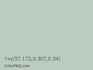 Yxy 57.172,0.307,0.34 Color is a light green color and the nearest color is Powder Ash #bcc9c2. Hex code #bbcbc2 and RGB value is rgb(187,203,194). In RGB color space, this color is composed of 73% red, 80% green, 76% blue, In CMYK color space, this color is composed of 8% cyan, 0% magenta, 4% yellow , 20% black , In HSL color space, this color has a hue angle of 146° , 13% saturation and 76% lightness.