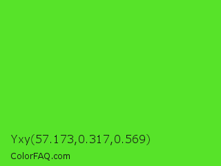Yxy 57.173,0.317,0.569 Color is a normal green color and the nearest color is Harlequin Green #46cb18. Hex code #57e329 and RGB value is rgb(87,227,41). In RGB color space, this color is composed of 34% red, 89% green, 16% blue, In CMYK color space, this color is composed of 62% cyan, 0% magenta, 82% yellow , 11% black , In HSL color space, this color has a hue angle of 105° , 77% saturation and 53% lightness.