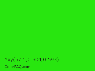 Yxy 57.1,0.304,0.593 Color is a normal green color and the nearest color is Neon Green #39ff14. Hex code #28e60f and RGB value is rgb(40,230,15). In RGB color space, this color is composed of 16% red, 90% green, 6% blue, In CMYK color space, this color is composed of 83% cyan, 0% magenta, 93% yellow , 10% black , In HSL color space, this color has a hue angle of 113° , 88% saturation and 48% lightness.