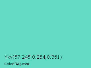 Yxy 57.245,0.254,0.361 Color is a light cyan color and the nearest color is Downy #6fd0c5. Hex code #62dbc4 and RGB value is rgb(98,219,196). In RGB color space, this color is composed of 38% red, 86% green, 77% blue, In CMYK color space, this color is composed of 55% cyan, 0% magenta, 11% yellow , 14% black , In HSL color space, this color has a hue angle of 169° , 63% saturation and 62% lightness.