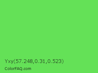 Yxy 57.248,0.31,0.523 Color is a light green color and the nearest color is Screamin Green #66ff66. Hex code #64e157 and RGB value is rgb(100,225,87). In RGB color space, this color is composed of 39% red, 88% green, 34% blue, In CMYK color space, this color is composed of 56% cyan, 0% magenta, 61% yellow , 12% black , In HSL color space, this color has a hue angle of 114° , 70% saturation and 61% lightness.