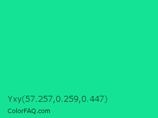 Yxy 57.257,0.259,0.447 Color is a normal green color and the nearest color is Caribbean Green #00cc99. Hex code #14e395 and RGB value is rgb(20,227,149). In RGB color space, this color is composed of 8% red, 89% green, 58% blue, In CMYK color space, this color is composed of 91% cyan, 0% magenta, 34% yellow , 11% black , In HSL color space, this color has a hue angle of 157° , 84% saturation and 48% lightness.