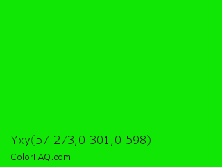 Yxy 57.273,0.301,0.598 Color is a normal green color and the nearest color is Green #00ff00. Hex code #11e705 and RGB value is rgb(17,231,5). In RGB color space, this color is composed of 7% red, 91% green, 2% blue, In CMYK color space, this color is composed of 93% cyan, 0% magenta, 98% yellow , 9% black , In HSL color space, this color has a hue angle of 117° , 96% saturation and 46% lightness.