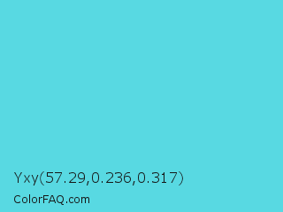 Yxy 57.29,0.236,0.317 Color is a light cyan color and the nearest color is Viking #64ccdb. Hex code #58d9e2 and RGB value is rgb(88,217,226). In RGB color space, this color is composed of 35% red, 85% green, 89% blue, In CMYK color space, this color is composed of 61% cyan, 4% magenta, 0% yellow , 11% black , In HSL color space, this color has a hue angle of 184° , 70% saturation and 62% lightness.