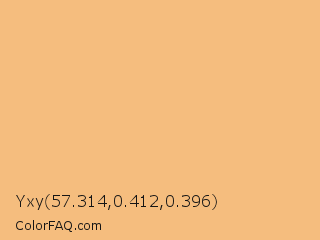 Yxy 57.314,0.412,0.396 Color is a light orange color and the nearest color is Mellow Apricot #f8b878. Hex code #f5bd7e and RGB value is rgb(245,189,126). In RGB color space, this color is composed of 96% red, 74% green, 49% blue, In CMYK color space, this color is composed of 0% cyan, 23% magenta, 49% yellow , 4% black , In HSL color space, this color has a hue angle of 32° , 86% saturation and 73% lightness.