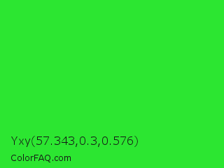 Yxy 57.343,0.3,0.576 Color is a normal green color and the nearest color is Lime Green #32cd32. Hex code #2ce631 and RGB value is rgb(44,230,49). In RGB color space, this color is composed of 17% red, 90% green, 19% blue, In CMYK color space, this color is composed of 81% cyan, 0% magenta, 79% yellow , 10% black , In HSL color space, this color has a hue angle of 122° , 79% saturation and 54% lightness.