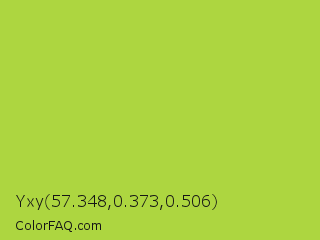 Yxy 57.348,0.373,0.506 Color is a normal lime color and the nearest color is Conifer #acdd4d. Hex code #add640 and RGB value is rgb(173,214,64). In RGB color space, this color is composed of 68% red, 84% green, 25% blue, In CMYK color space, this color is composed of 19% cyan, 0% magenta, 70% yellow , 16% black , In HSL color space, this color has a hue angle of 76° , 65% saturation and 55% lightness.
