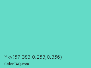 Yxy 57.383,0.253,0.356 Color is a light cyan color and the nearest color is Downy #6fd0c5. Hex code #63dbc7 and RGB value is rgb(99,219,199). In RGB color space, this color is composed of 39% red, 86% green, 78% blue, In CMYK color space, this color is composed of 55% cyan, 0% magenta, 9% yellow , 14% black , In HSL color space, this color has a hue angle of 170° , 63% saturation and 62% lightness.