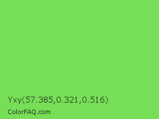 Yxy 57.385,0.321,0.516 Color is a light green color and the nearest color is Mantis #74c365. Hex code #77df57 and RGB value is rgb(119,223,87). In RGB color space, this color is composed of 47% red, 87% green, 34% blue, In CMYK color space, this color is composed of 47% cyan, 0% magenta, 61% yellow , 13% black , In HSL color space, this color has a hue angle of 106° , 68% saturation and 61% lightness.
