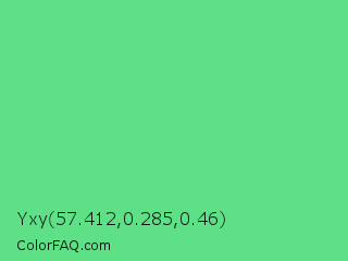 Yxy 57.412,0.285,0.46 Color is a light green color and the nearest color is Very Light Malachite Green #64e986. Hex code #5ee086 and RGB value is rgb(94,224,134). In RGB color space, this color is composed of 37% red, 88% green, 53% blue, In CMYK color space, this color is composed of 58% cyan, 0% magenta, 40% yellow , 12% black , In HSL color space, this color has a hue angle of 138° , 68% saturation and 62% lightness.
