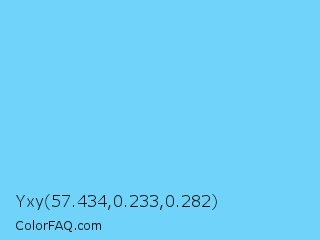Yxy 57.434,0.233,0.282 Color is a light blue color and the nearest color is Sky Blue #76d7ea. Hex code #70d4fa and RGB value is rgb(112,212,250). In RGB color space, this color is composed of 44% red, 83% green, 98% blue, In CMYK color space, this color is composed of 55% cyan, 15% magenta, 0% yellow , 2% black , In HSL color space, this color has a hue angle of 197° , 93% saturation and 71% lightness.