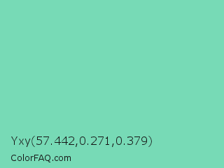 Yxy 57.442,0.271,0.379 Color is a light green color and the nearest color is Bermuda #7dd8c6. Hex code #77dab6 and RGB value is rgb(119,218,182). In RGB color space, this color is composed of 47% red, 85% green, 71% blue, In CMYK color space, this color is composed of 45% cyan, 0% magenta, 17% yellow , 15% black , In HSL color space, this color has a hue angle of 158° , 57% saturation and 66% lightness.