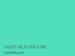 Yxy 57.45,0.253,0.38 Color is a normal cyan color and the nearest color is Eucalyptus #44d7a8. Hex code #50deba and RGB value is rgb(80,222,186). In RGB color space, this color is composed of 31% red, 87% green, 73% blue, In CMYK color space, this color is composed of 64% cyan, 0% magenta, 16% yellow , 13% black , In HSL color space, this color has a hue angle of 165° , 68% saturation and 59% lightness.