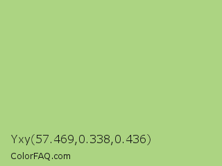 Yxy 57.469,0.338,0.436 Color is a light green color and the nearest color is Feijoa #9fdd8c. Hex code #acd482 and RGB value is rgb(172,212,130). In RGB color space, this color is composed of 67% red, 83% green, 51% blue, In CMYK color space, this color is composed of 19% cyan, 0% magenta, 39% yellow , 17% black , In HSL color space, this color has a hue angle of 89° , 49% saturation and 67% lightness.