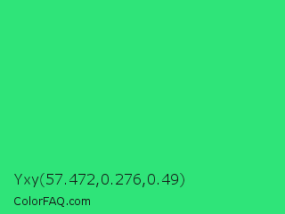 Yxy 57.472,0.276,0.49 Color is a normal green color and the nearest color is UFO Green #3cd070. Hex code #2fe479 and RGB value is rgb(47,228,121). In RGB color space, this color is composed of 18% red, 89% green, 47% blue, In CMYK color space, this color is composed of 79% cyan, 0% magenta, 47% yellow , 11% black , In HSL color space, this color has a hue angle of 145° , 77% saturation and 54% lightness.