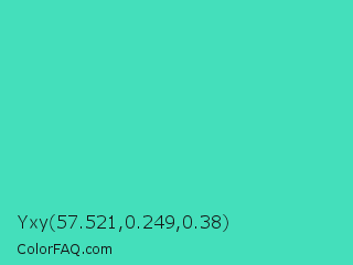 Yxy 57.521,0.249,0.38 Color is a normal cyan color and the nearest color is Eucalyptus #44d7a8. Hex code #44dfbb and RGB value is rgb(68,223,187). In RGB color space, this color is composed of 27% red, 87% green, 73% blue, In CMYK color space, this color is composed of 70% cyan, 0% magenta, 16% yellow , 13% black , In HSL color space, this color has a hue angle of 166° , 71% saturation and 57% lightness.