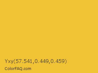 Yxy 57.541,0.449,0.459 Color is a normal orange color and the nearest color is Saffron #f4c430. Hex code #f1c235 and RGB value is rgb(241,194,53). In RGB color space, this color is composed of 95% red, 76% green, 21% blue, In CMYK color space, this color is composed of 0% cyan, 20% magenta, 78% yellow , 5% black , In HSL color space, this color has a hue angle of 45° , 87% saturation and 58% lightness.